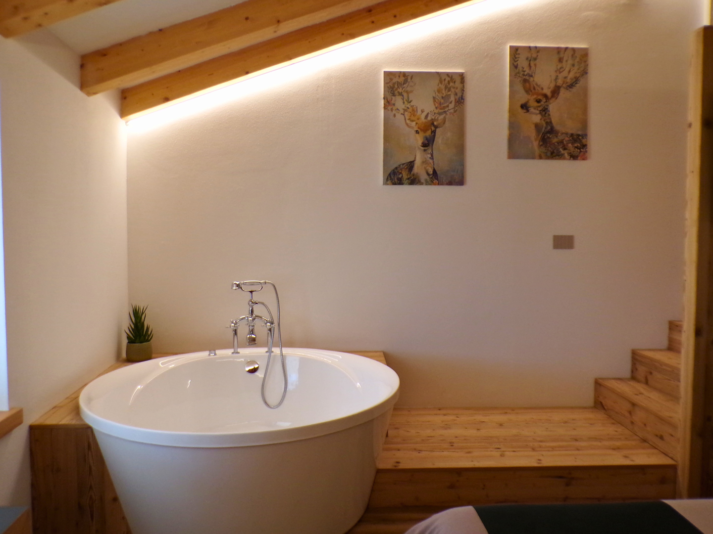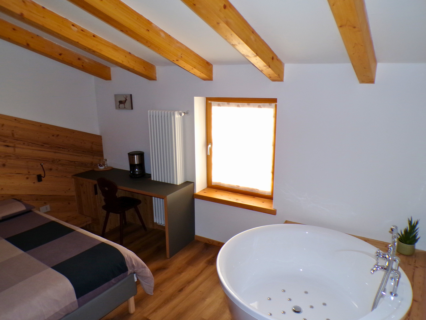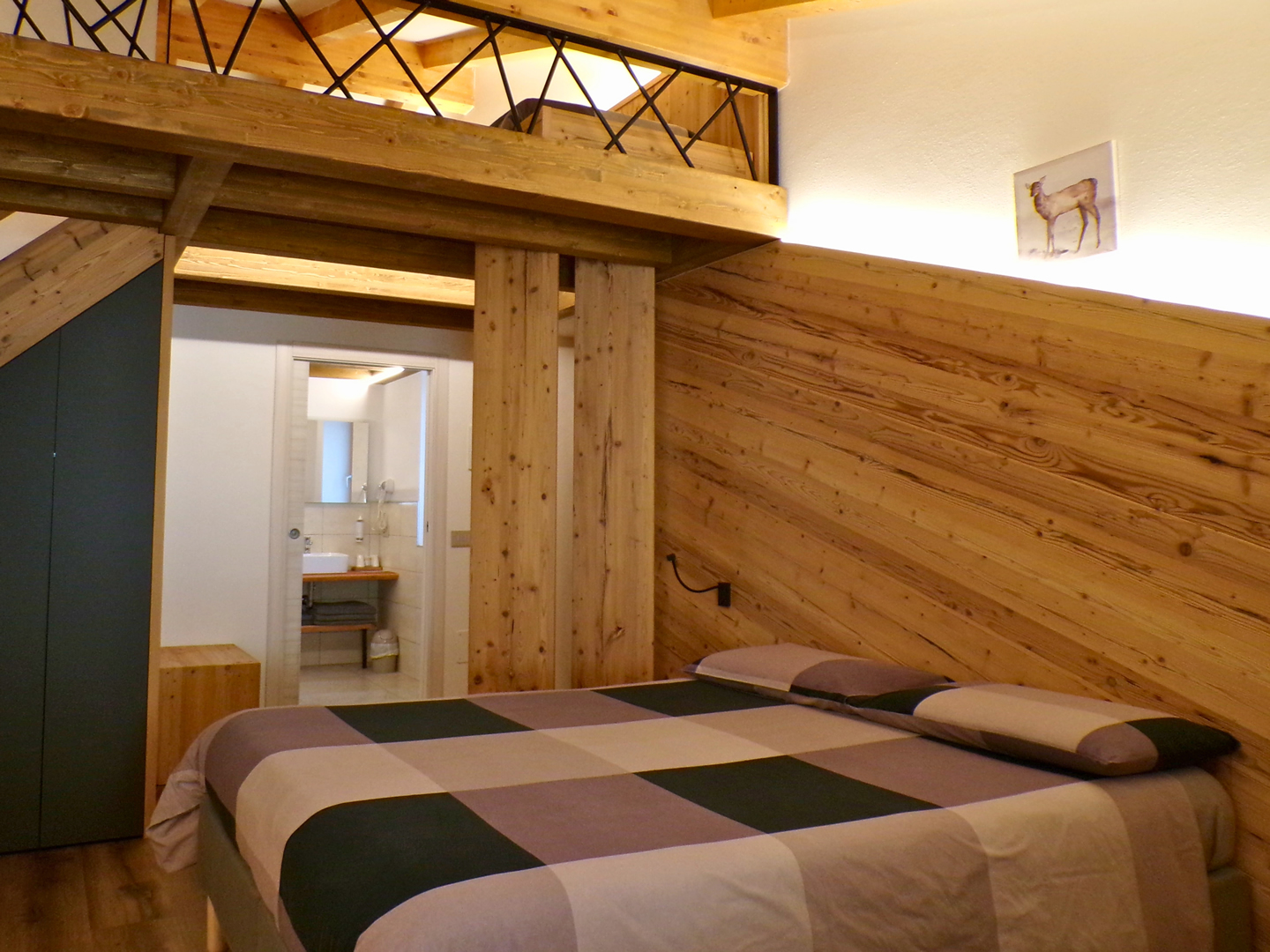 SUITE di 53 Mq adatta ad ospitare anche famiglie numerose. Camera in legno, ricca di particolari che ricordano il re dei nostri boschi. Sul soppalco è presente una vasca idromassaggio per due persone, un comodo divano e la compagnia di un eco-caminetto. Attraverso gli ampi finestroni presenti nella camera si ha la possibilità di ammirare il Castel Belfort e la Paganella.
