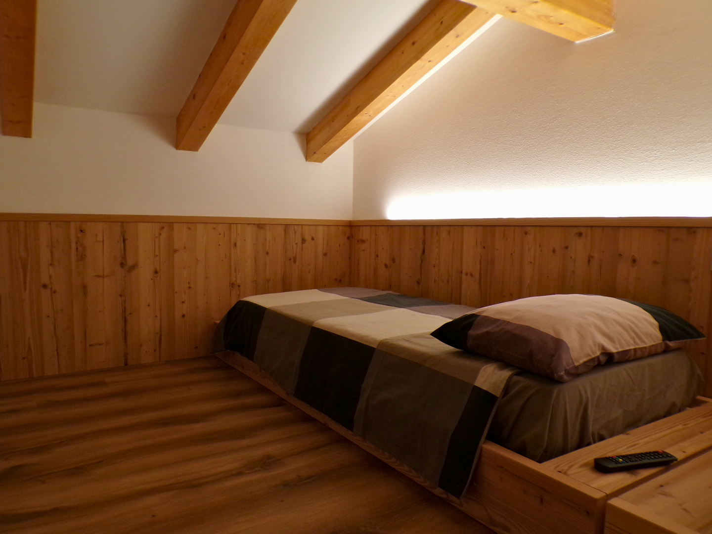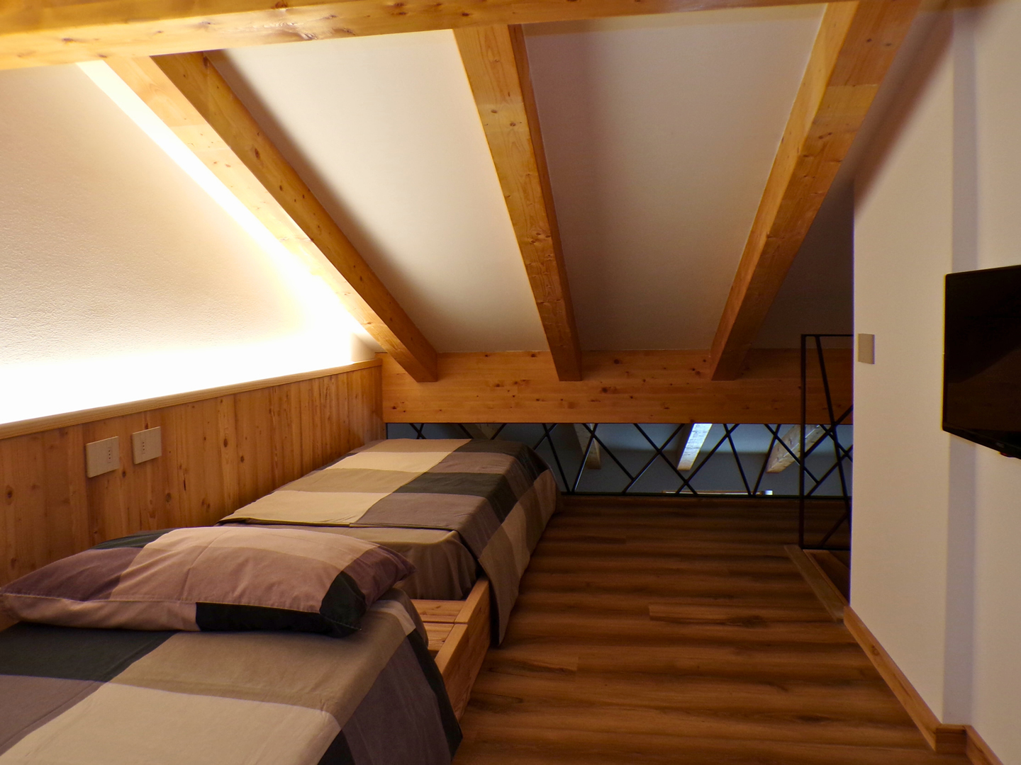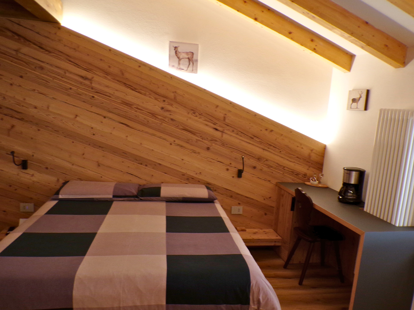 18 Mq, arredamento in legno con dettagli nella camera che richiamano il lupo.